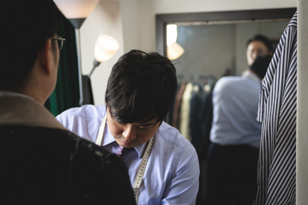• その服を纏うシーンや求める印象を丁寧にお伺いし、ビジネスやフォーマルからカジュアルまで、お客様の個性を最大に引き立てる一着を共に描き出します。