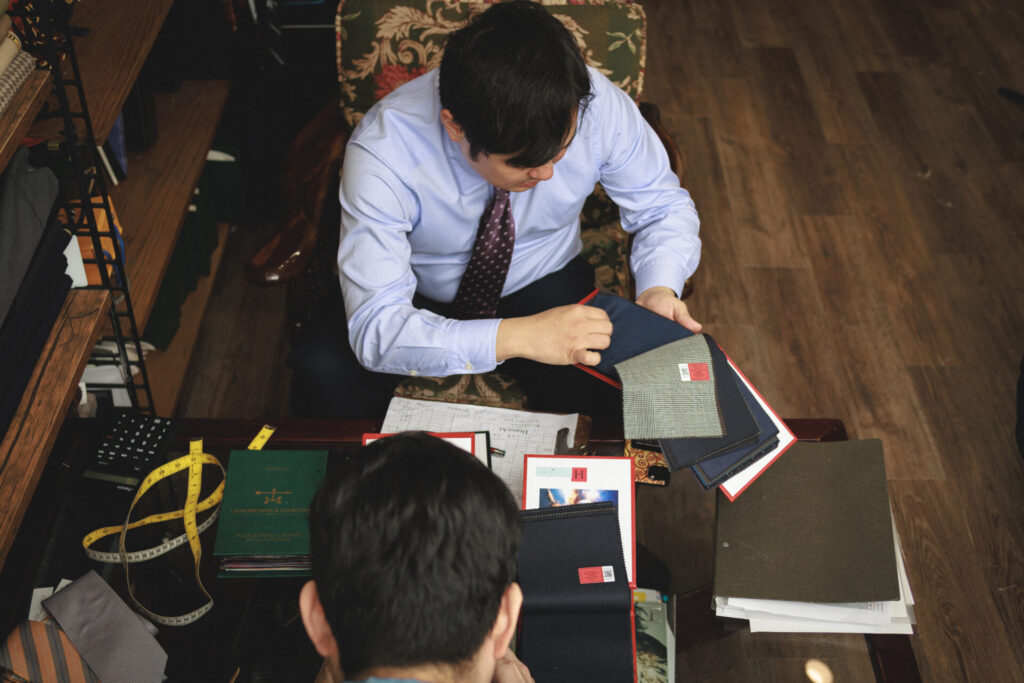 • 生地やディテール選びとデザインの打ち合わせ、採寸を行います。